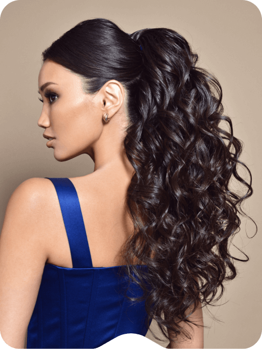 Высокий объемный хвост на очень длинных азиатских волосах